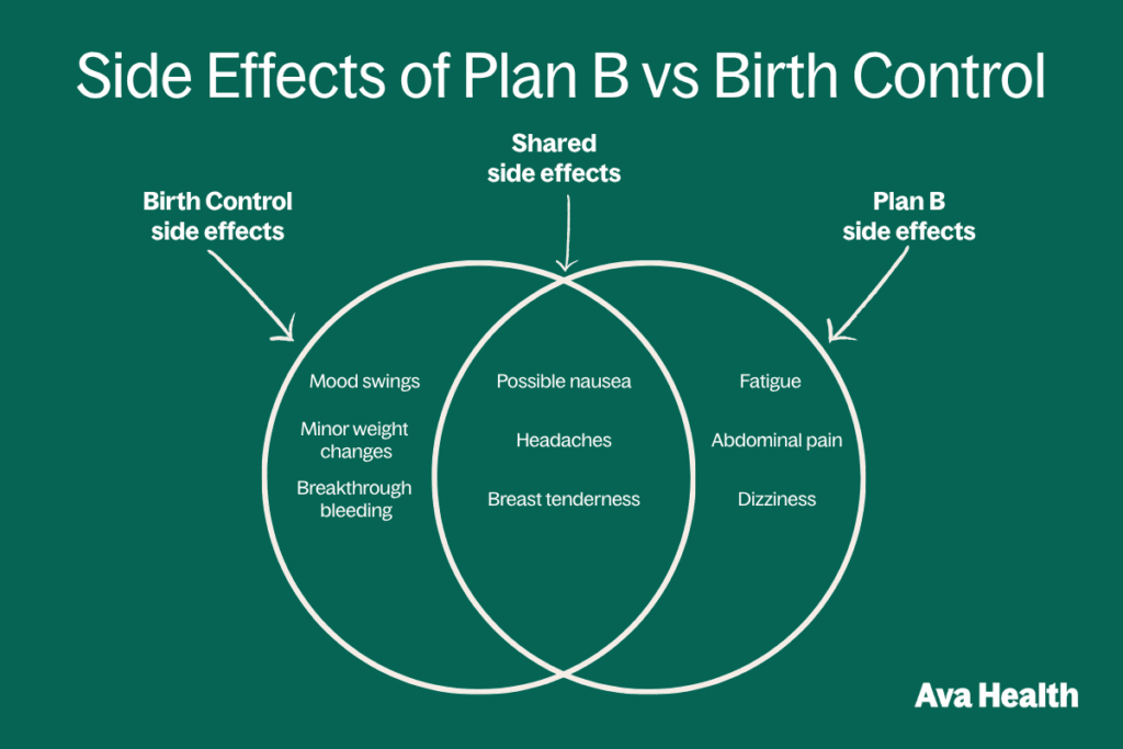 - Plan B: nausea, abdominal pain, fatigue, headache, dizziness, breast tenderness—typically short-lived and resolves within a day